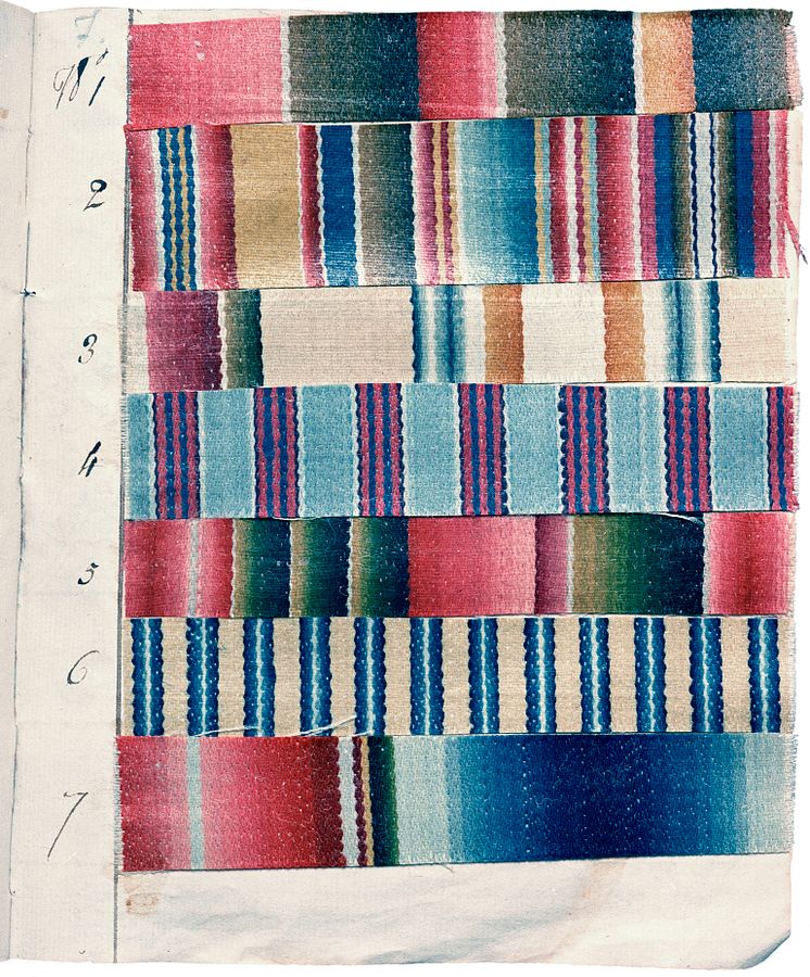I utställningen visas några helt unika randiga tygprover från 1700-talet, i skick som nya. Proverna ingår i professor Anders Berchs samling av modeller och varuprover, som sedan 1876 finns i Nordiska museet. Fotograf: Ulla Wåger, Nordiska museet.