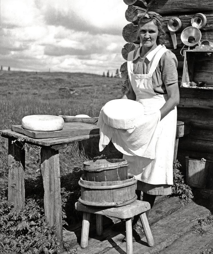Osttillverkning på fäbodvall. Källvallens fäbod i Jämtland 1943. Fotograf: Karl Heinz Hernried