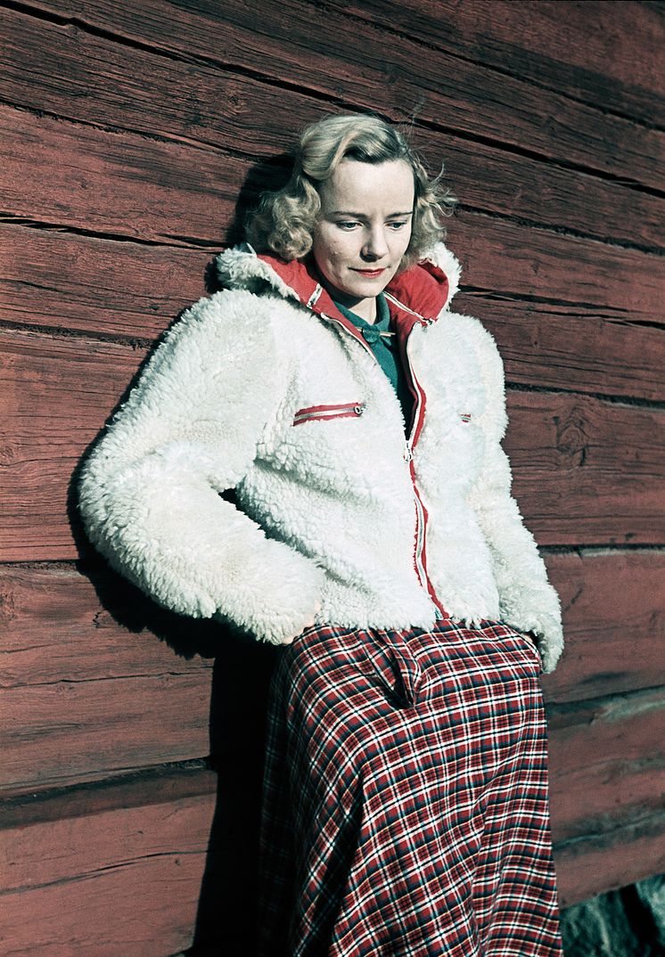 Klädd för friluftsliv. En färgmatchad ung kvinna i fuskpälsjacka och rutig kjol, 1941. Foto: Gunnar Lundh, © Nordiska museet