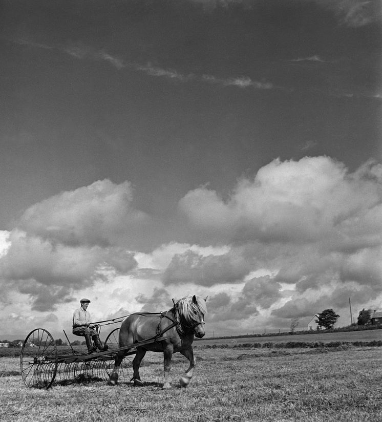 Hästdragen hjulräfsa på slättbygden vid Lösen kyrka i östra Blekinge. Foto: Erik Liljeroth ©Nordiska museet